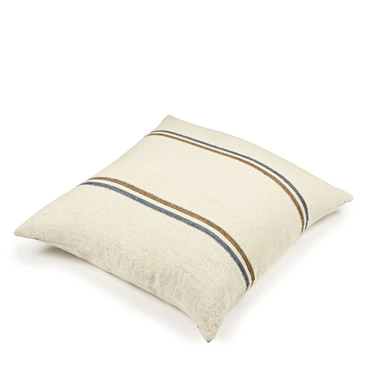 Made from linen, this ecru cushion has a washed finish featuring navy and bronze stripes.