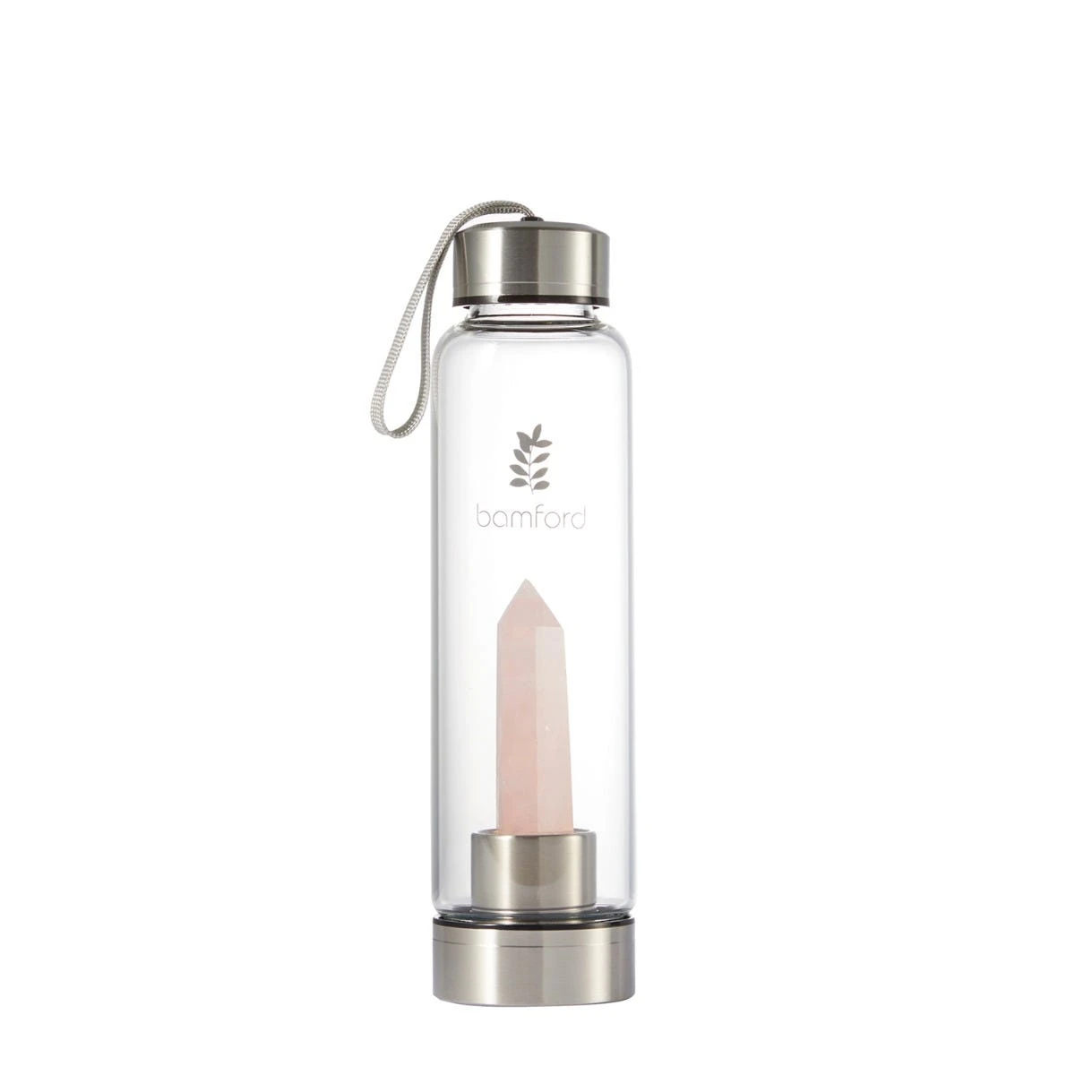 The Bamford crystal water bottle is made from glass and stainless steel, with a removable crystal to purify and emit calming and creative energy.