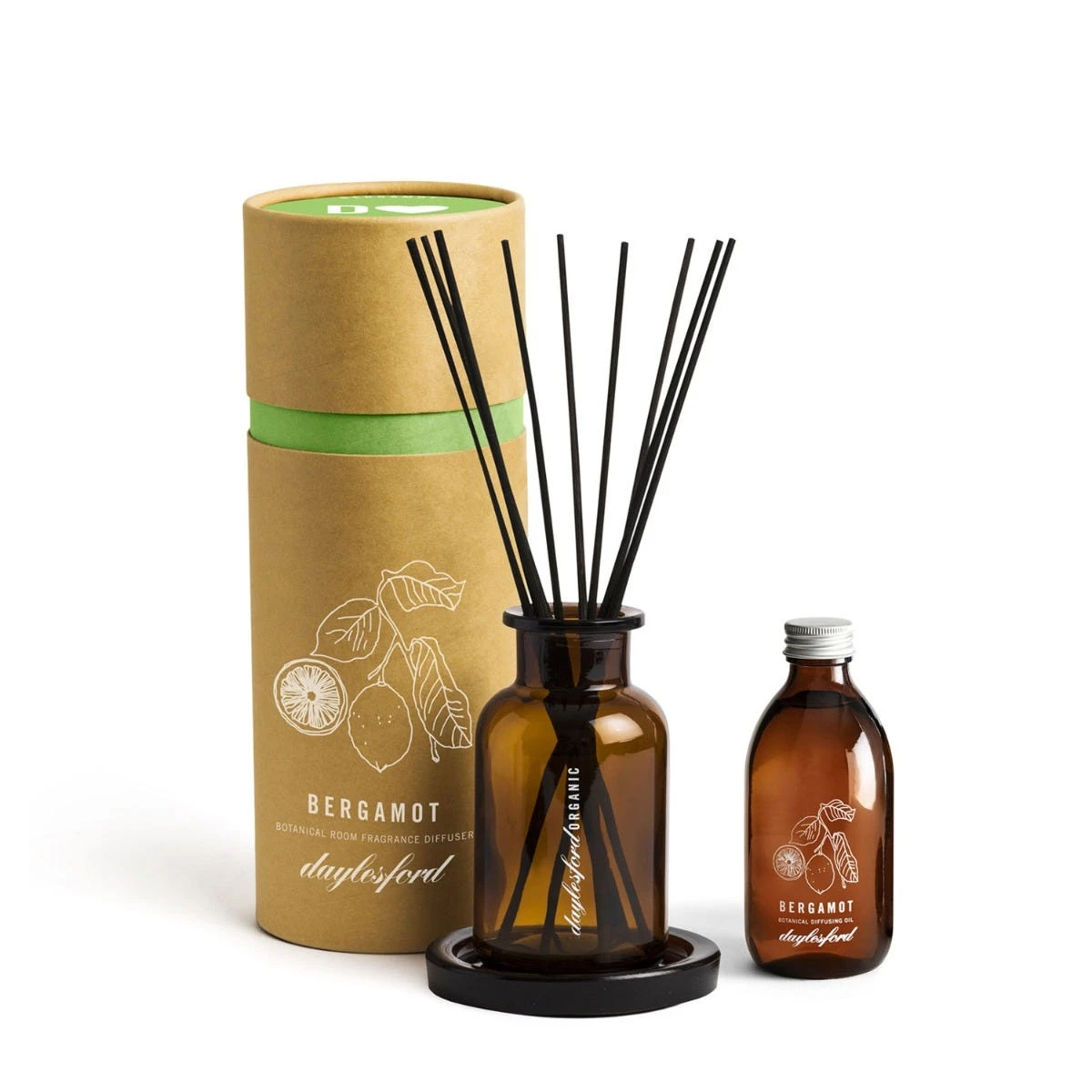 This bergamot diffuser gift set includes rattan reeds, hand blown gloss bottle, a lid and coaster.