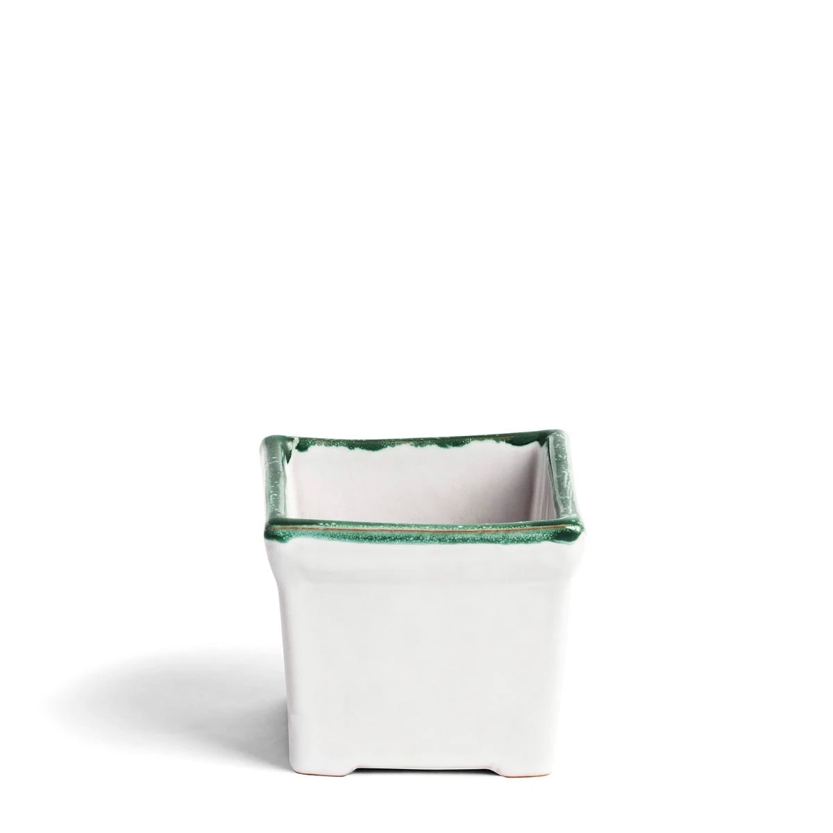 White planter made from terracotta clay with green edge, suitable for indoor or outdoor use but not frost proof.