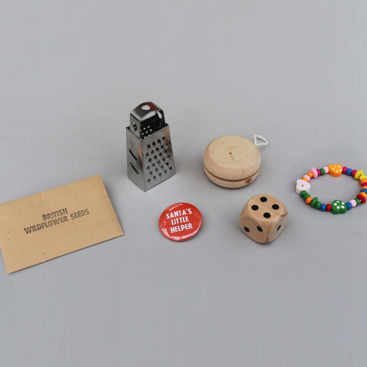 | Details | Contents of crackers: British flower seeds which are annually flowering, great pollinators and easy to grow on any soil. Wooden yoyo. Large wooden dice. Mini grater. Children’s wooden beaded bracelet. ‘Santa’s little helper’ badge. Made using sustainable paper. Recycle after use. |
