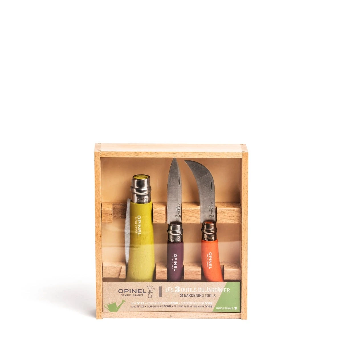 Includes Saw N°12, Garden knife N°08 and Pruning knife N°08 made by Opinel.
