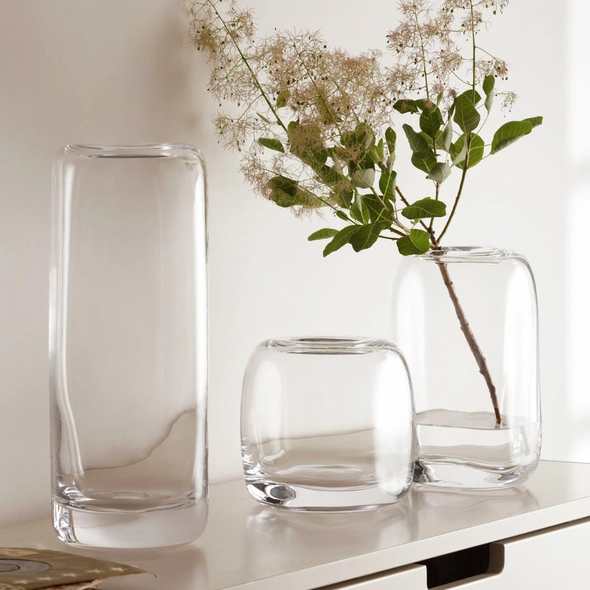 A heavy mouth-blown glass vase in a soft, rounded cube shape. The versatile size is suitable for a variety of seasonal floral displays.