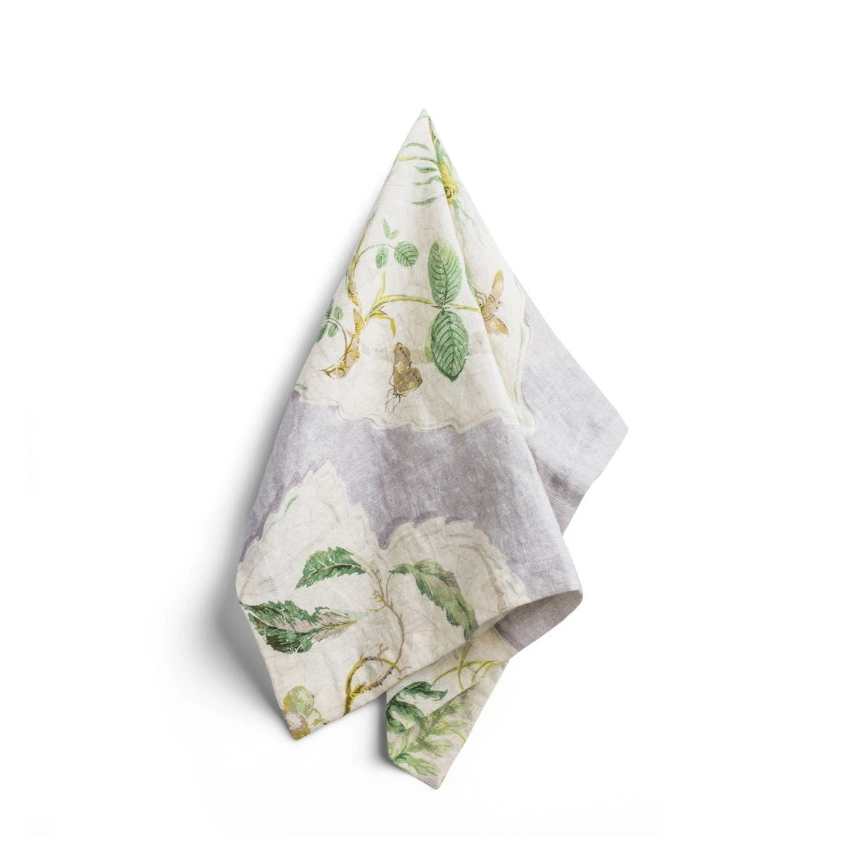 British rosehips are the focus of this pure linen napkin in lilac, inspired by antique illustrations.
