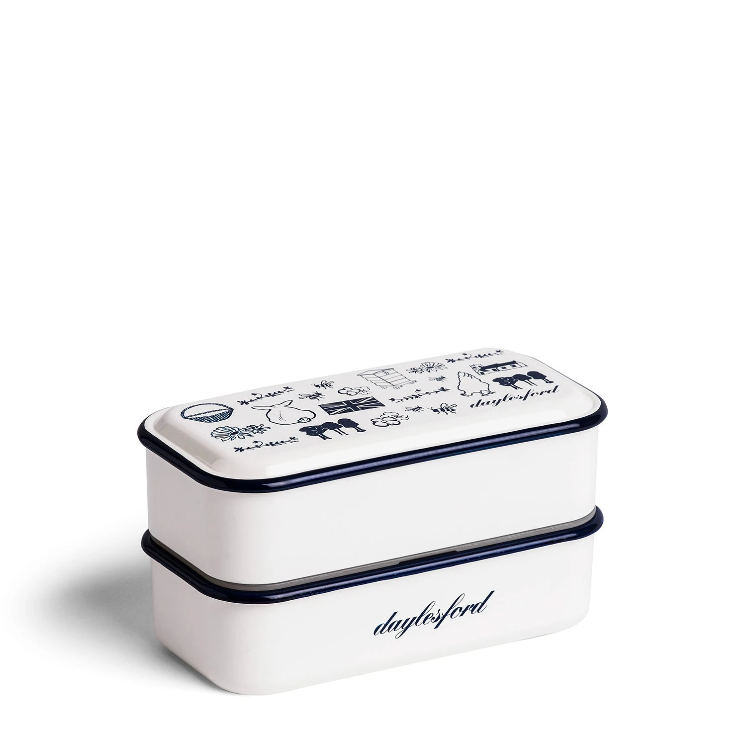 A double Daylesford bento box. Our range of children’s bento boxes feature an exclusively commissioned Hugo Guinness illustration inspired by the nature on our farm.