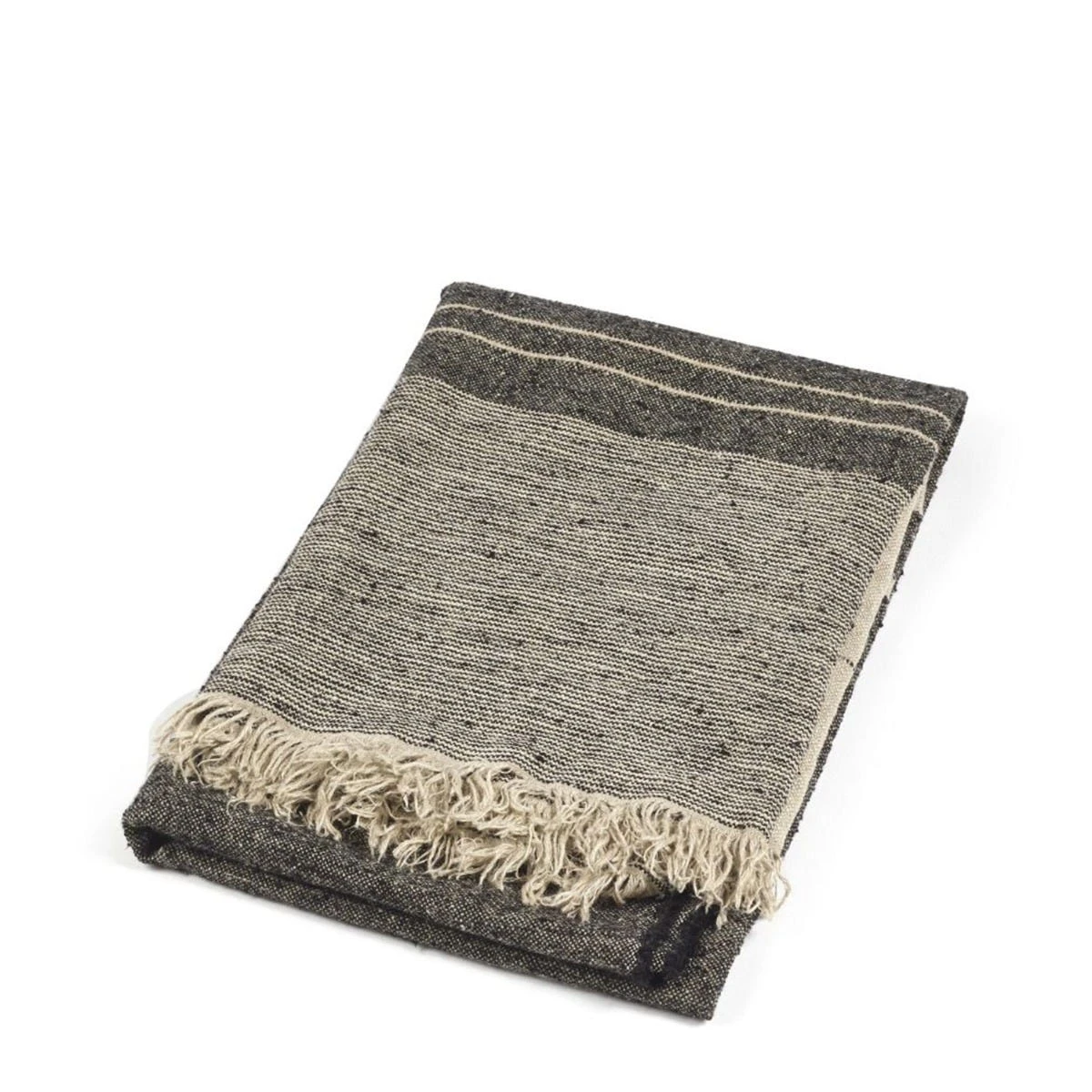 This soft throw features a combination of natural flax and black stripe details. Both ends are finished with a flax fringe.