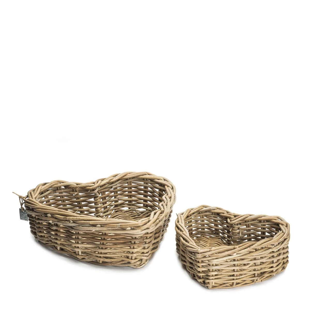 A set of two heart-shaped natural, hand woven rattan planters. Suitable for indoor and outdoor use.