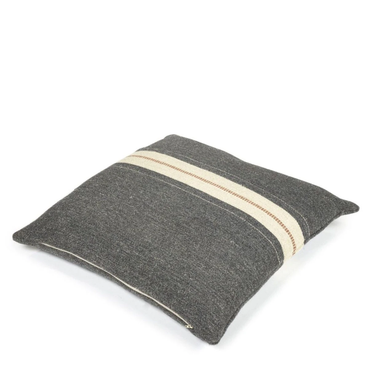Made from a blend of linen and wool, this warm grey cushion features ecru and copper stitch details.