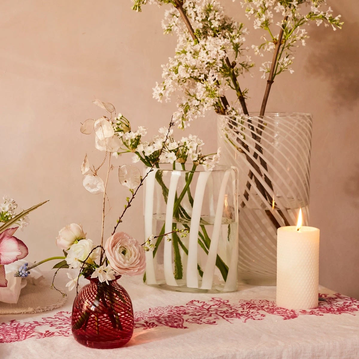 A handmade and mouth-blown white spiral vase, ideal for displaying seasonal flowers and pretty foliage from the garden.