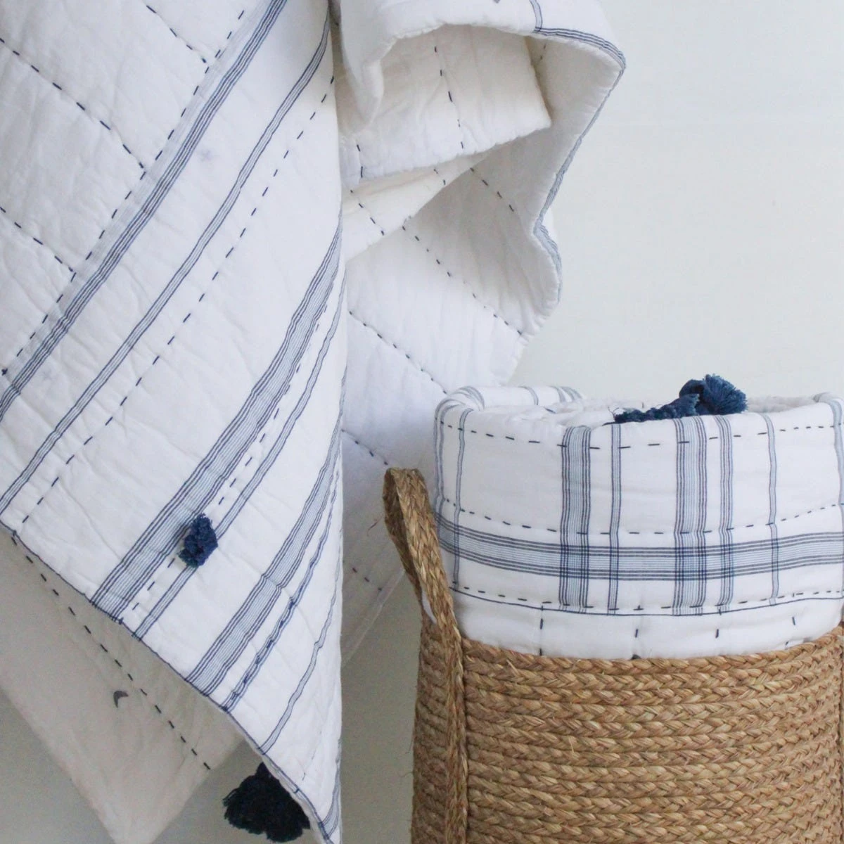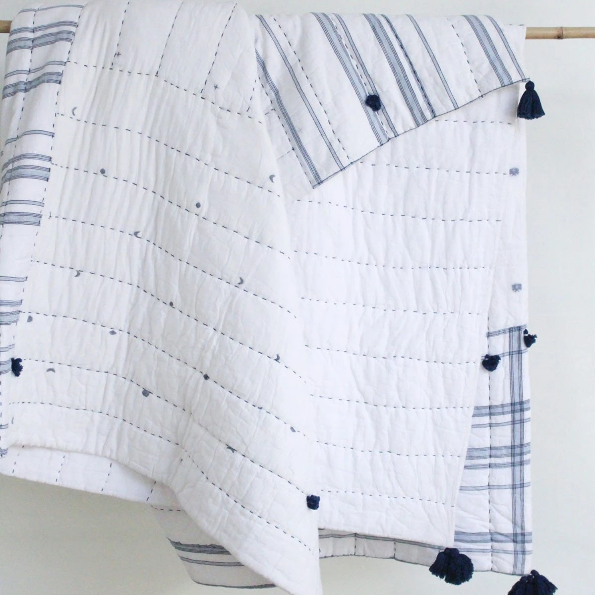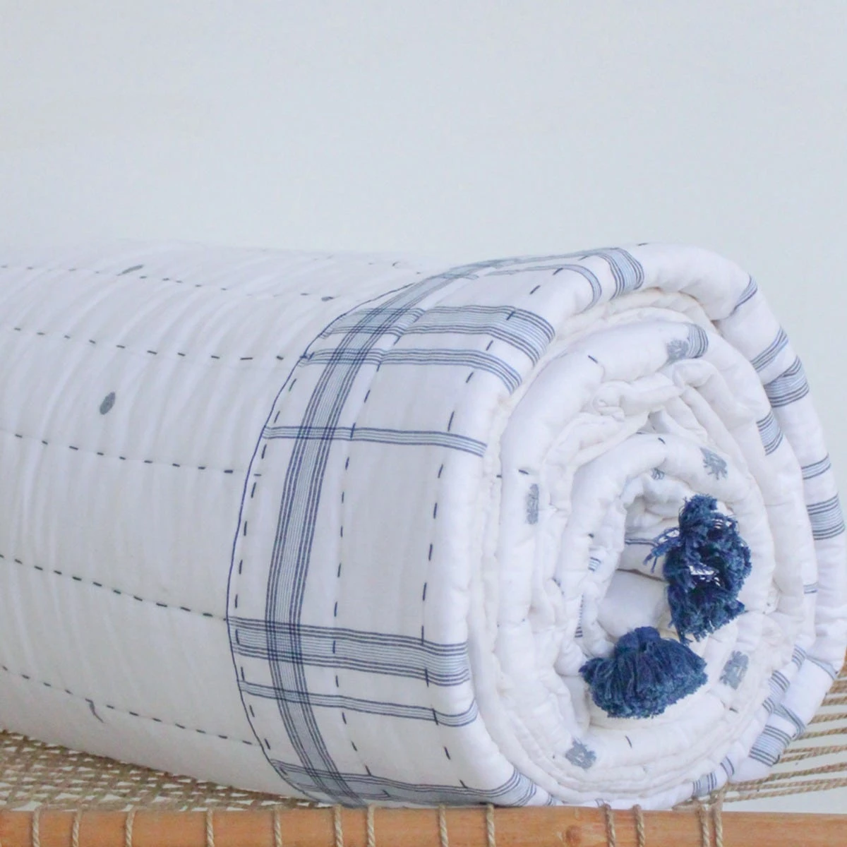 Hand-quilted with women’s groups in Rajasthan, using the finest naturally dyed cotton weaves from West Bengal.