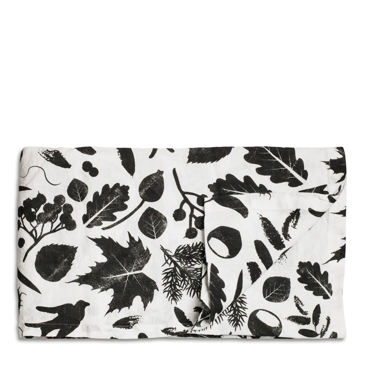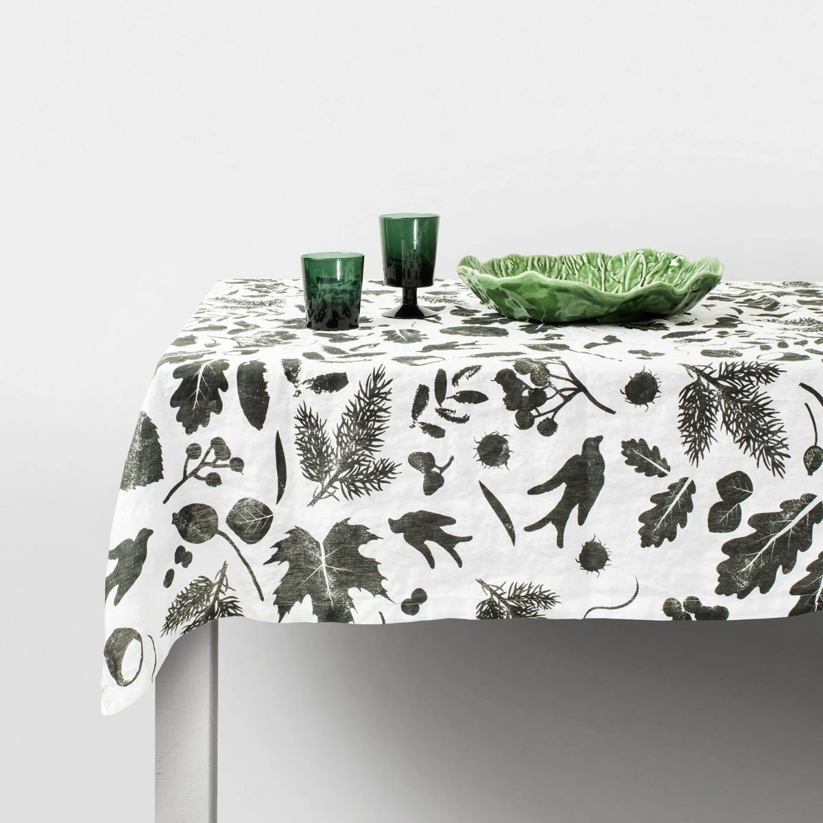 A dark grey linen tablecloth with oak leaf design which is inspired by the oak tree on the Daylesford Market Garden.
