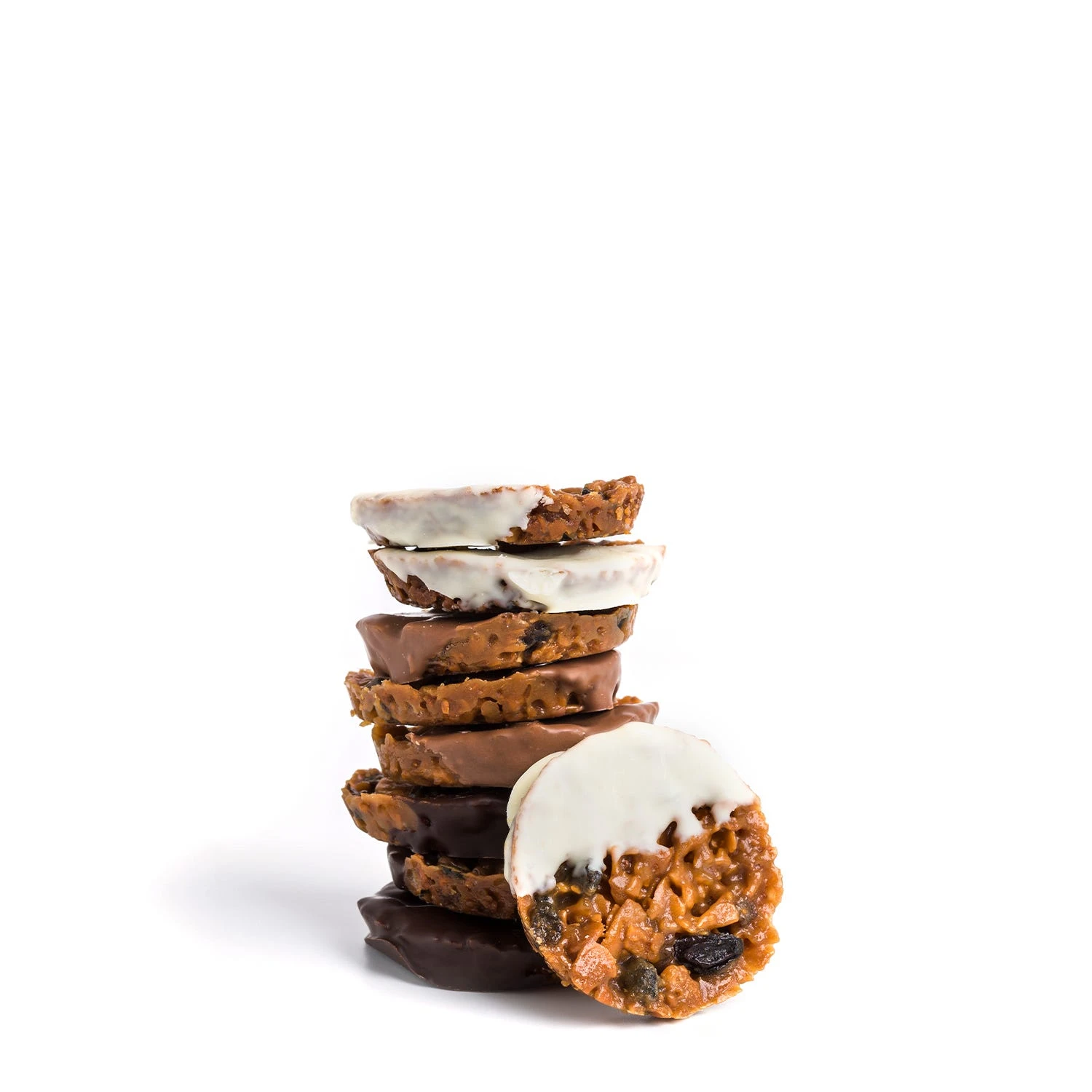 | Details | Lightly spiced nuts and preserved fruit held together in chewy caramel, coated on one side with dark, milk or white chocolate. These delicious sweet chocolate florentines are the perfect afternoon tea or after dinner treat. SOIL ASSOCIATION BOOM AWARDS 2019 Best Organic Bakery Sweet Biscuits, Snacks & Cakes Category – Winner |