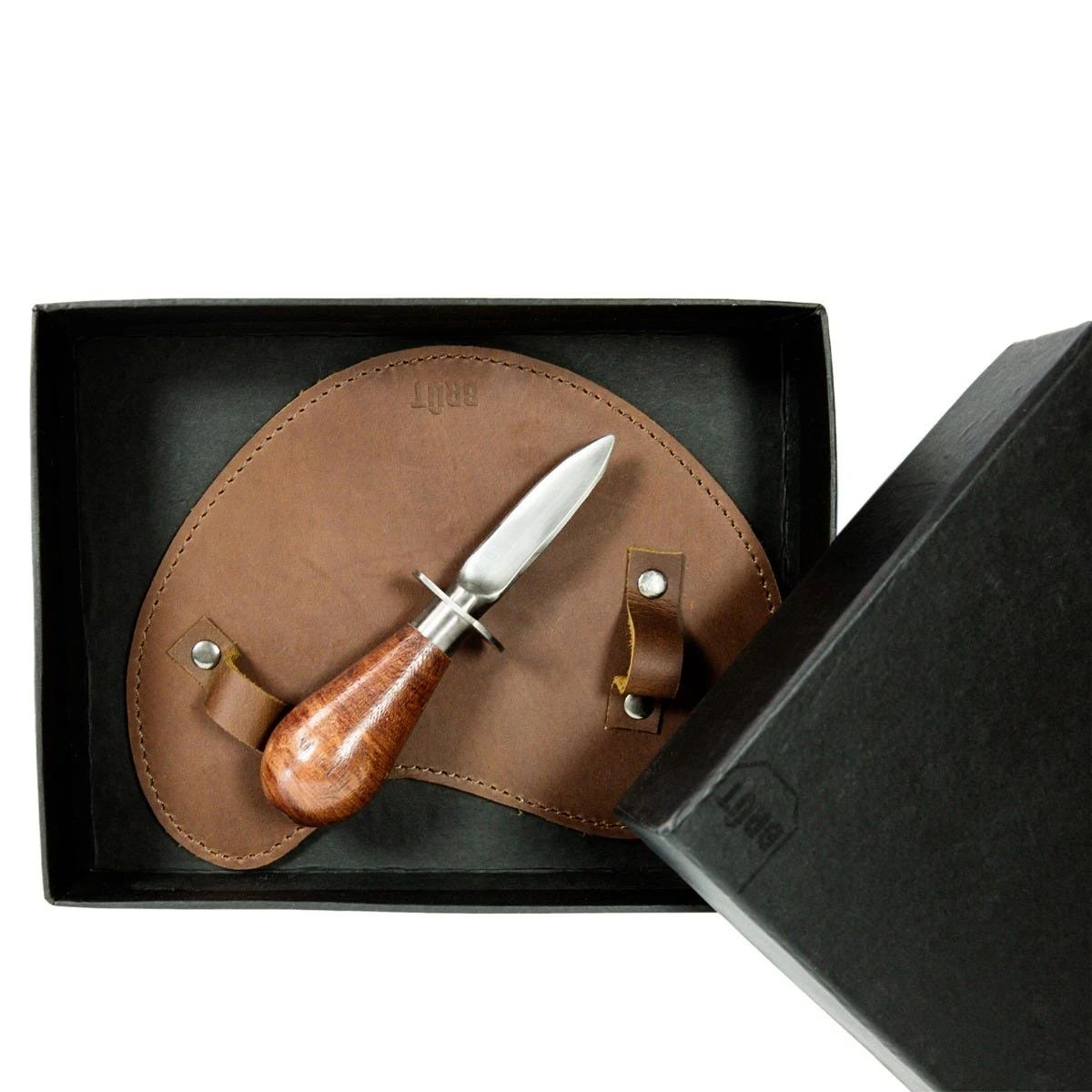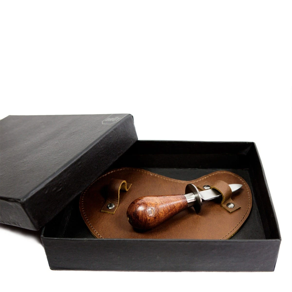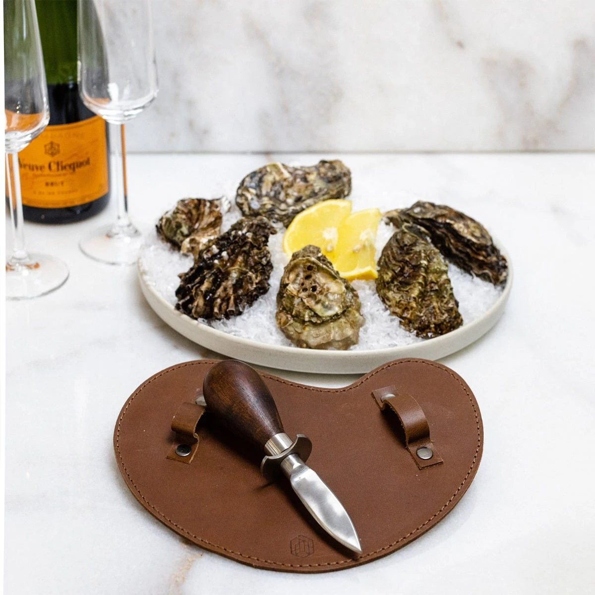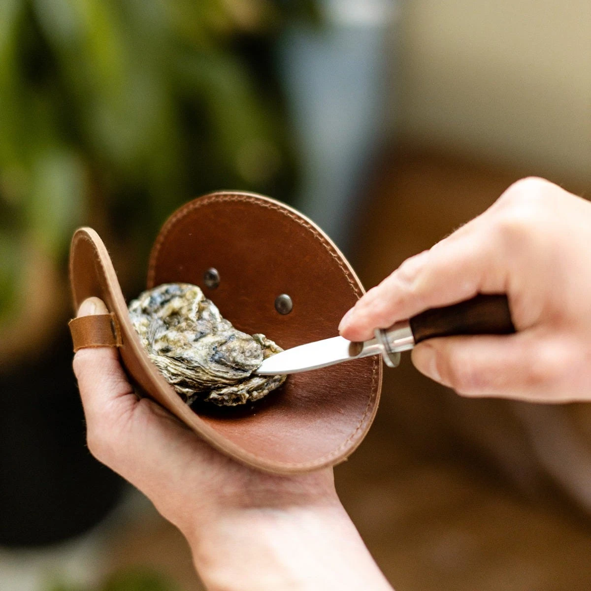 A traditional oyster knife made from stainless steel and acacia wood, while the buffalo leather glove protects your hand when shucking oysters.