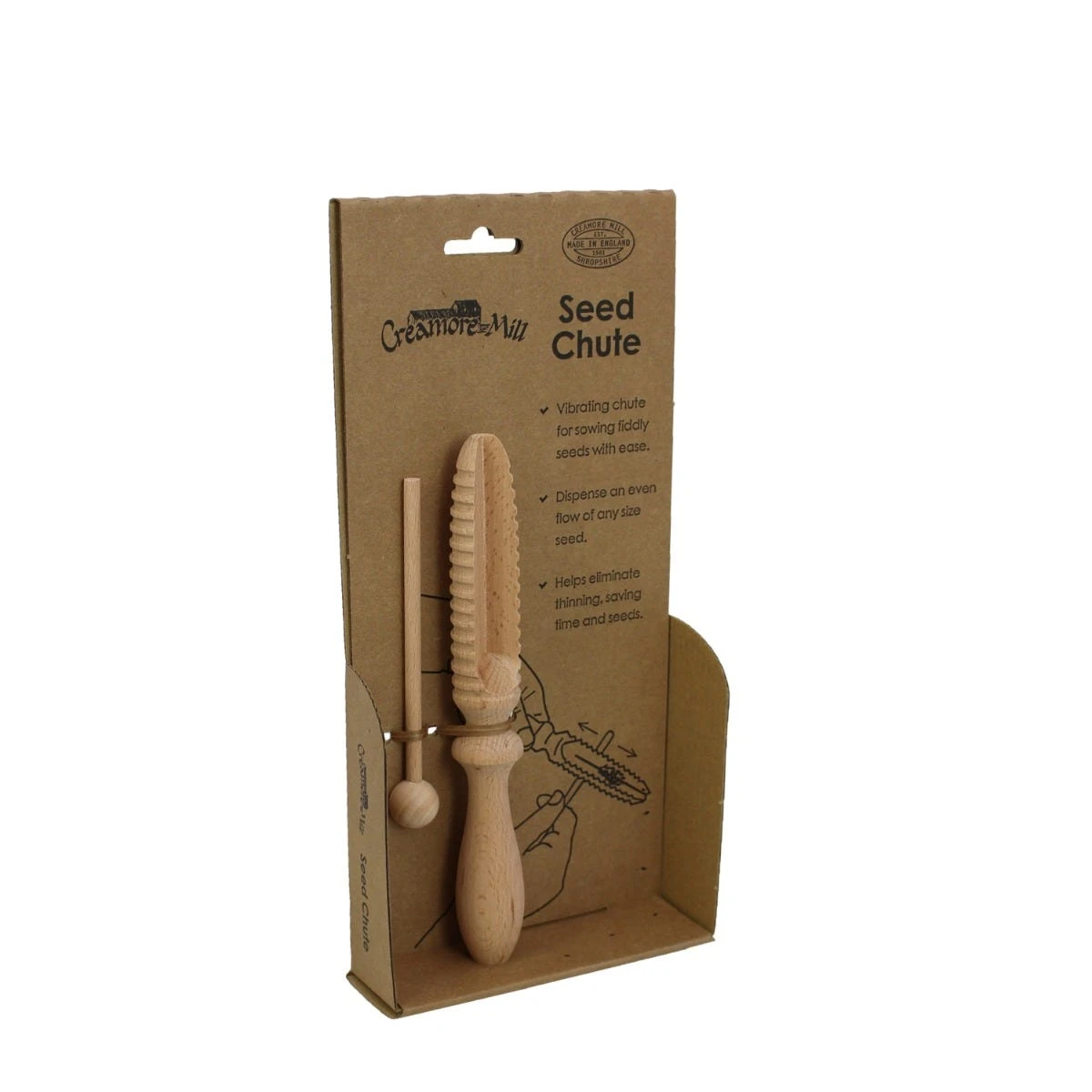 Simply pour your seeds into the large groove along the length of the chute, then run the stick provided along the ridges carved into the base. The vibrations ensure a steady flow, meaning seeds are dispensed evenly. This helps avoid thinning which saves both time and seeds.