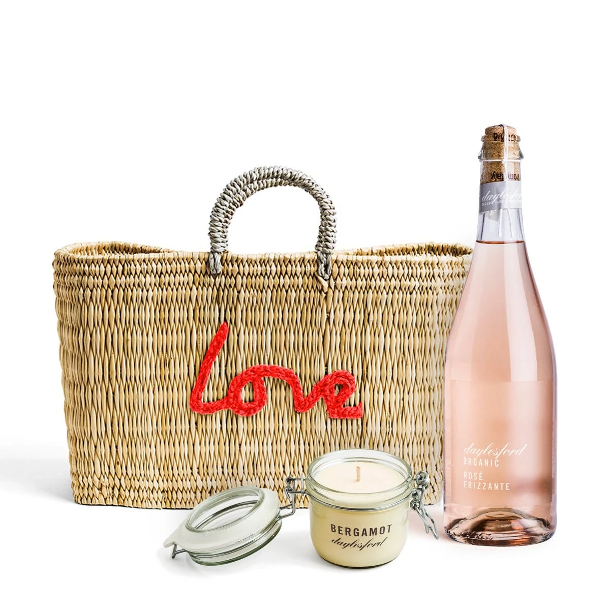 We’ve paired our stylish, practical and versatile Love basket bag with two of our bestselling gift items: a bottle of delicately sparkling rosé frizzante and a long-burning, natural wax candle scented with bergamot.